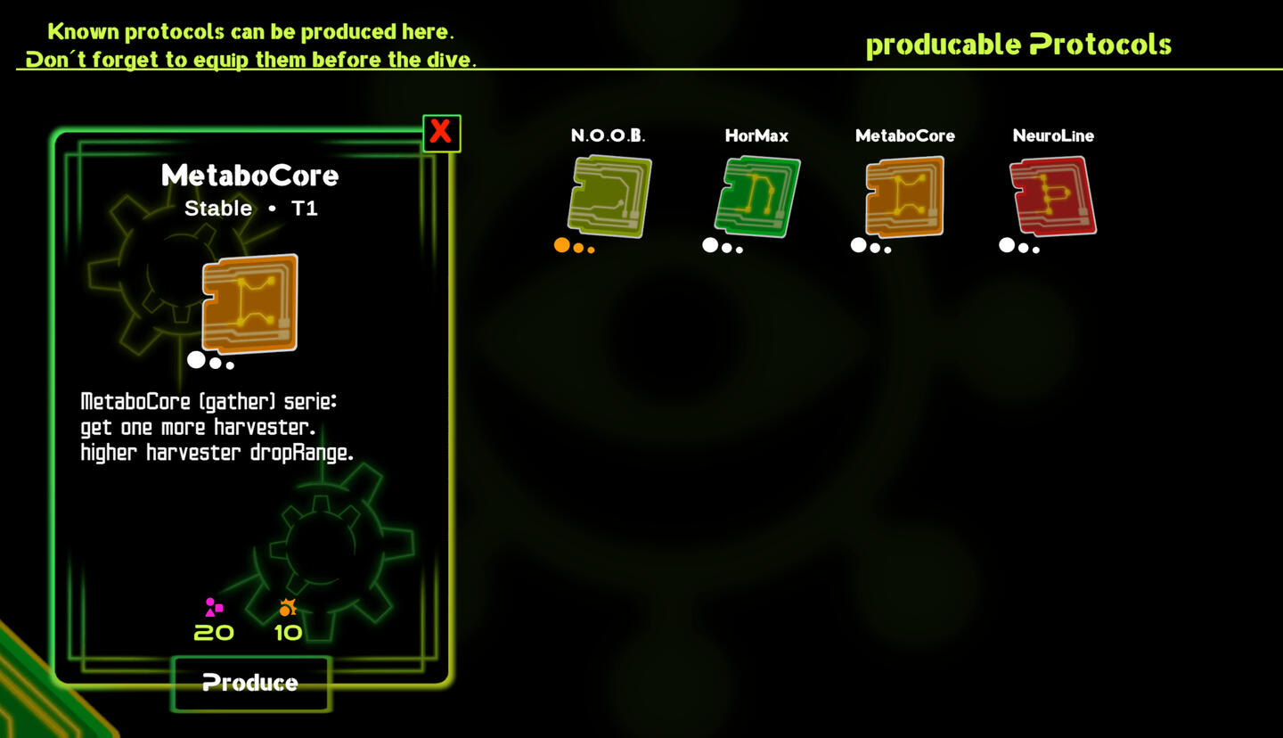 Unlock protocol types via blueprints, craft them in the Hub, and equip them as consumable run modifiers.